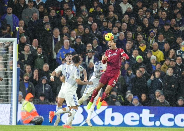 Virgil van Dijk of Liverpool jumps up to win the high ball during the Premier League match Leeds United vs Liverpool at Elland Road, Leeds, United Kingdom, 6th December 2025, Credit:Richard Bierton/News Images / Avalon