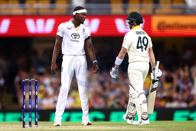 Jofra Archa of England and Steve Smith of Australia react during the day 4 of the Second Test in the NRMA Insurance Ashes Series Australia vs England at The Gabba, Brisbane Cricket Ground, Brisbane, Australia, 7th December 2025, Credit:Pat Hoelscher/News Images / Avalon