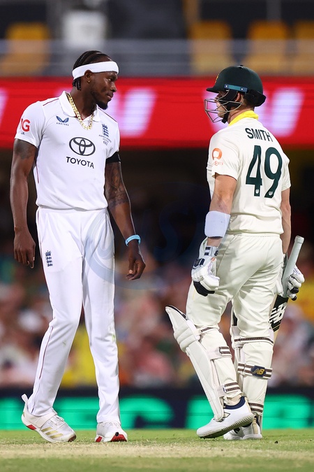 Jofra Archa of England and Steve Smith of Australia react during the day 4 of the Second Test in the NRMA Insurance Ashes Series Australia vs England at The Gabba, Brisbane Cricket Ground, Brisbane, Australia, 7th December 2025, Credit:Pat Hoelscher/News Images / Avalon