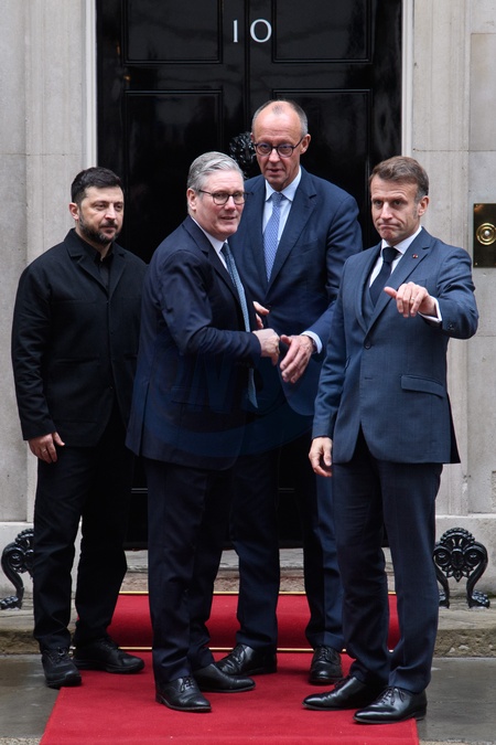 (L-R) - Volodymyr Zelenskyy - President of Ukraine, British Prime Minister Sir Keir Starmer, Friedrich Merz - Chancellor of Germany, Emmanuel Macron - President of France in Downing Street, London, England, UK on Monday 8 December, 2025., Credit:Justin Ng / Avalon