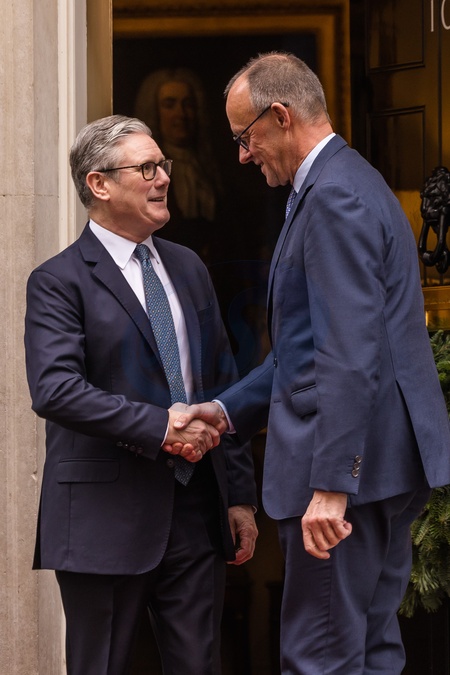 Downing Street, London, UK. 8th December 2025. British Prime Minister, Keir Starmer, welcomes the German Chancellor Friedrich Merz, to Downing Street, London, UK.The meeting, along with French President Emmanuel Macron and Ukrainian President Volodymyr Zelenskyy is to discuss ending the war in Ukraine., Credit:Photo by Amanda Rose / Avalon