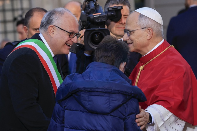 Feast of the Immaculate Conception of Mary, ceremony in Piazza Mignanelli, near the Spanish Steps. In the photo, Mayor Roberto Gualtieri and his son greet Pope Leo XIV at the end of the ceremony. Rome, Italy 08 December 2025, Credit:Richard De Luca / Avalon