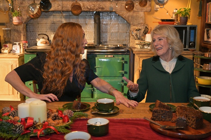 Britain's Queen Camilla, gestures as she speaks to actor Victoria Smurfi on the film set of the The Rivals, in Bristol, England, Monday, Dec. 8, 2025., Credit:Anthony Upton / Avalon