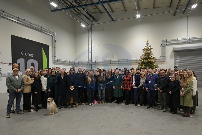 Britain's Queen Camilla, poses with members of the cast and crew during a fist to the film set of the The Rivals, in Bristol, England, Monday, Dec. 8, 2025., Credit:Anthony Upton / Avalon