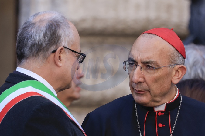 Feast of the Immaculate Conception of Mary, ceremony in Piazza Mignanelli, near the Spanish Steps. Pictured: Roberto Gualtieri and Cardinal Vicar Baldassare Reina. Rome, Italy 08 December 2025, Credit:Richard De Luca / Avalon