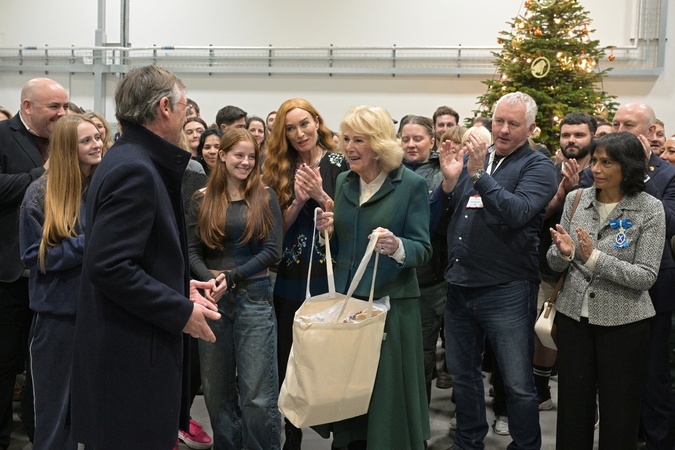 Britain's Queen Camilla, holds a tote bag as she poses with members of the cast and crew during a visit to the film set of the The Rivals, in Bristol, England, Monday, Dec. 8, 2025., Credit:Anthony Upton / Avalon