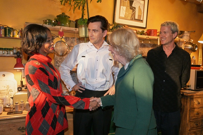 Britain's Queen Camilla, shakes hands with actor Nafessa Williams as actor David Tennant looks on during her visit to the film set of the The Rivals, in Bristol, England, Monday, Dec. 8, 2025., Credit:Anthony Upton / Avalon
