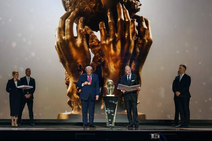 President Donald Trump accepts the inaugural FIFA Peace Prize from FIFA President Gianni Infantino, Friday, December 5, 2025, during the FIFA World Cup drawing at the John F. Kennedy Center for the Performing Arts in Washington, D.C., Credit:Daniel Torok / Avalon