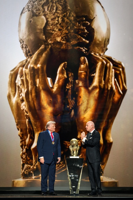 President Donald Trump accepts the inaugural FIFA Peace Prize from FIFA President Gianni Infantino, Friday, December 5, 2025, during the FIFA World Cup drawing at the John F. Kennedy Center for the Performing Arts in Washington, D.C., Credit:Daniel Torok / Avalon