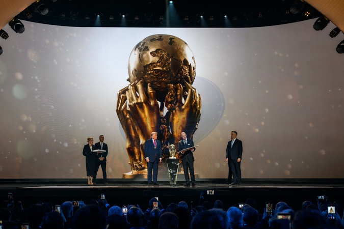 President Donald Trump accepts the inaugural FIFA Peace Prize from FIFA President Gianni Infantino, Friday, December 5, 2025, during the FIFA World Cup drawing at the John F. Kennedy Center for the Performing Arts in Washington, D.C., Credit:Daniel Torok / Avalon