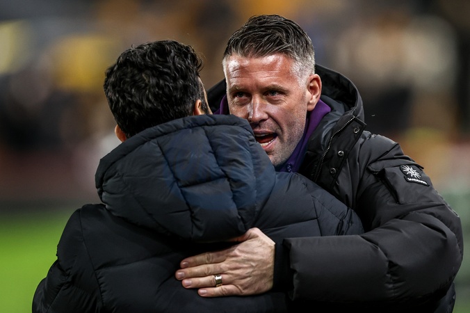 Rob Edwards manager of Wolverhampton Wanderers embraces Ruben Amorim manager of Manchester United during the Premier League match Wolverhampton Wanderers vs Manchester United at Molineux, Wolverhampton, United Kingdom, 8th December 2025, Credit:Ae Cosgrove/News Images / Avalon