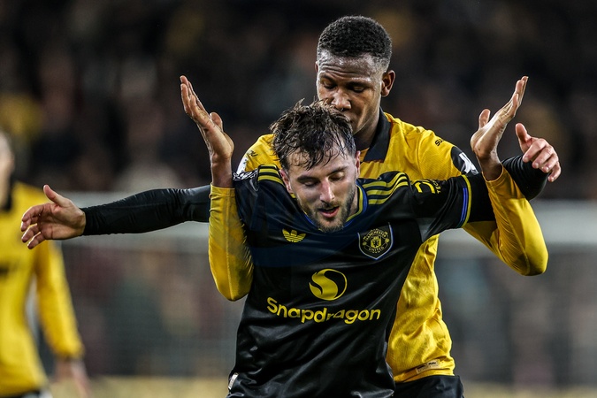 Yerson Mosquera of Wolverhampton Wanderers and Mason Mount of Manchester Untied battle for the ball during the Premier League match Wolverhampton Wanderers vs Manchester United at Molineux, Wolverhampton, United Kingdom, 8th December 2025, Credit:Ae Cosgrove/News Images / Avalon