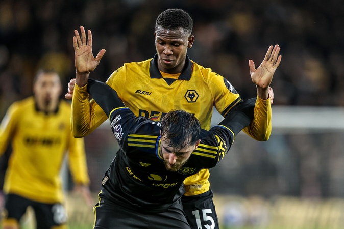 Yerson Mosquera of Wolverhampton Wanderers and Mason Mount of Manchester Untied battle for the ball during the Premier League match Wolverhampton Wanderers vs Manchester United at Molineux, Wolverhampton, United Kingdom, 8th December 2025, Credit:Ae Cosgrove/News Images / Avalon