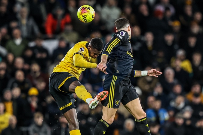 Yerson Mosquera of Wolverhampton Wanderers and Diogo Dalot of Manchester Untied battle for the high ball during the Premier League match Wolverhampton Wanderers vs Manchester United at Molineux, Wolverhampton, United Kingdom, 8th December 2025, Credit:Ae Cosgrove/News Images / Avalon
