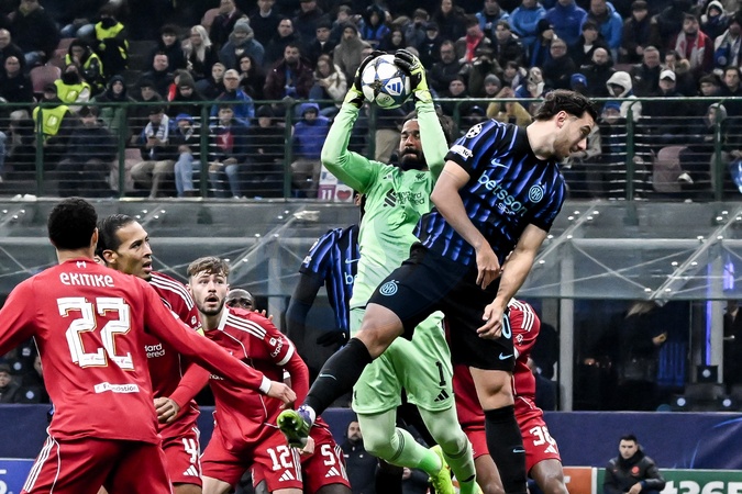 San Siro Stadium. Champions League. League phase, Matchday 6. Inter Vs Liverpool. Alisson Becker anticipates and saves on Carlos Carlos Augusto . Milan, Italy 09 december 2025, Credit:Nicola Marfisi / Avalon
