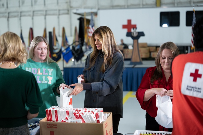 First Lady Melania Trump and Second Lady Usha Vance join the American Red Cross to deliver holiday care packages to military spouses