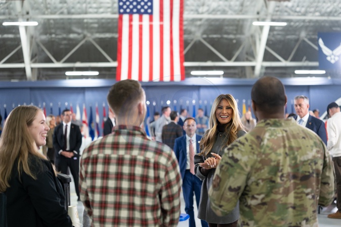 First Lady Melania Trump and Second Lady Usha Vance join the American Red Cross to deliver holiday care packages to military spouses at Joint Base Andrews, Monday, December 1, 2025., Credit:Andrea Hanks / Avalon