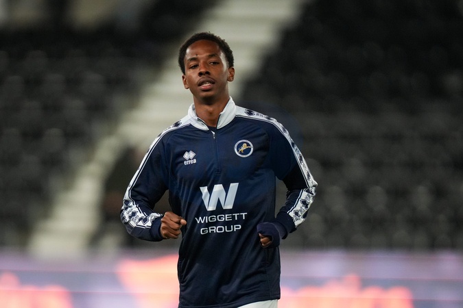 Raees Bangura-Williams of Millwall warms up during the Sky Bet Championship match Derby County vs Millwall at Pride Park Stadium, Derby, United Kingdom, 10th December 2025, Credit:Maynard Manyowa/News Images / Avalon