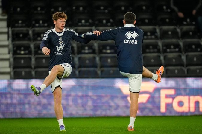 Millwall players warm up during the Sky Bet Championship match Derby County vs Millwall at Pride Park Stadium, Derby, United Kingdom, 10th December 2025, Credit:Maynard Manyowa/News Images / Avalon