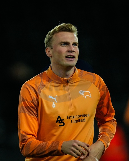 Sondre Langas of Derby County warms up during the Sky Bet Championship match Derby County vs Millwall at Pride Park Stadium, Derby, United Kingdom, 10th December 2025, Credit:Maynard Manyowa/News Images / Avalon
