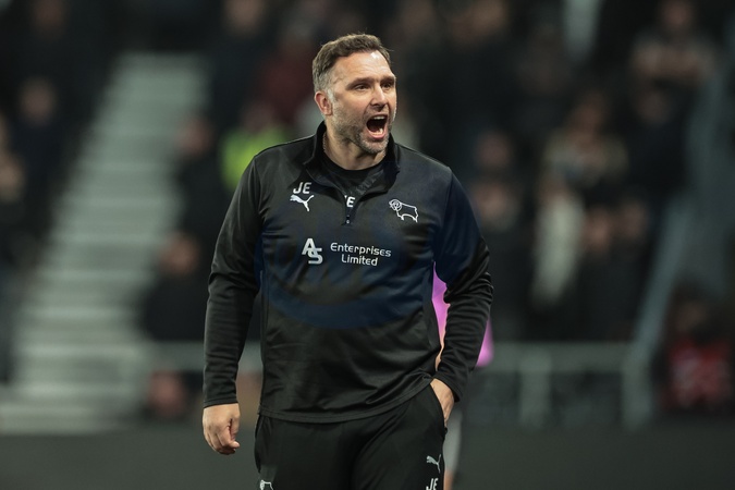 John Eustace manager of Derby County reacts in the technical area during the Sky Bet Championship match Derby County vs Millwall at Pride Park Stadium, Derby, United Kingdom, 10th December 2025, Credit:Mark Cosgrove/News Images / Avalon