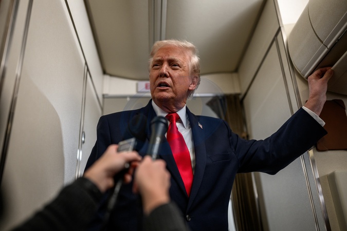 President Donald Trump answers questions from members of the media aboard Air Force One en route to Mount Pocono, Pennsylvania, for a rally on the economy, Tuesday, December 9, 2025., Credit:Molly Riley / Avalon