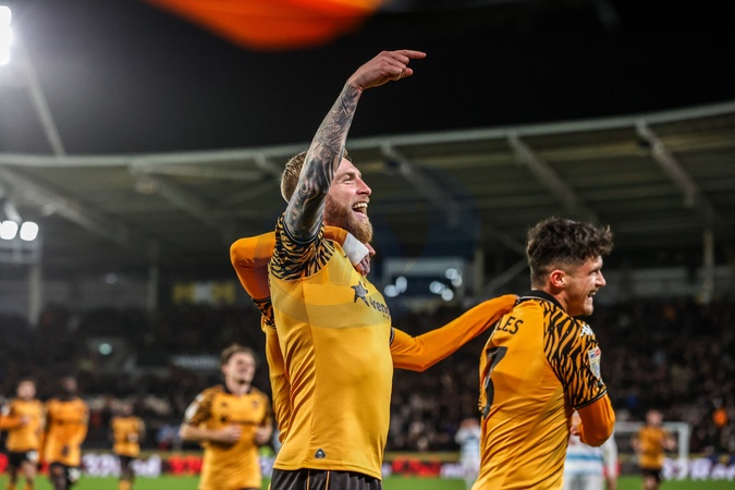 Oliver McBurnie of Hull City celebrates his goal to make it 2-0 during the Sky Bet Championship match Hull City vs Wrexham at MKM Stadium, Hull, United Kingdom, 10th December 2025, Credit:Ae Cosgrove/News Images / Avalon