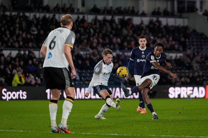 Raees Bangura-Williams of Millwall shoots at goal during the Sky Bet Championship match Derby County vs Millwall at Pride Park Stadium, Derby, United Kingdom, 10th December 2025, Credit:Maynard Manyowa/News Images / Avalon