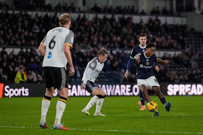 Raees Bangura-Williams of Millwall shoots at goal during the Sky Bet Championship match Derby County vs Millwall at Pride Park Stadium, Derby, United Kingdom, 10th December 2025, Credit:Maynard Manyowa/News Images / Avalon