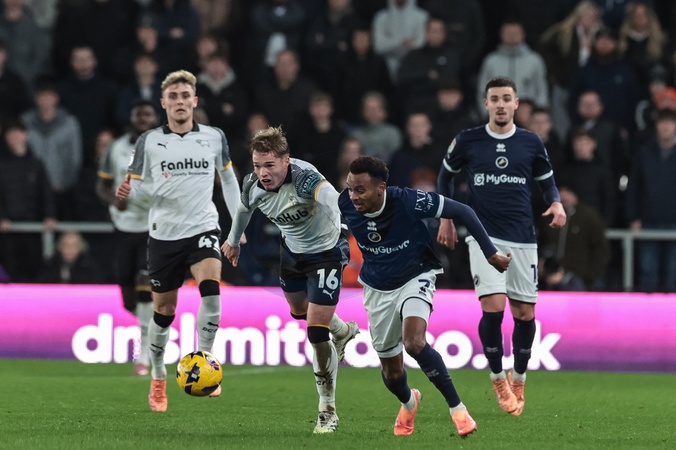 Liam Thompson of Derby County and Thierno Ballo of Millwall battle for the ball during the Sky Bet Championship match Derby County vs Millwall at Pride Park Stadium, Derby, United Kingdom, 10th December 2025, Credit:Mark Cosgrove/News Images / Avalon