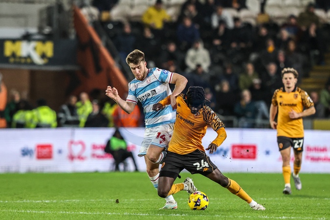 Darko Gyabi of Hull City is fouled by George Thomason of Wrexham during the Sky Bet Championship match Hull City vs Wrexham at MKM Stadium, Hull, United Kingdom, 10th December 2025, Credit:Ae Cosgrove/News Images / Avalon