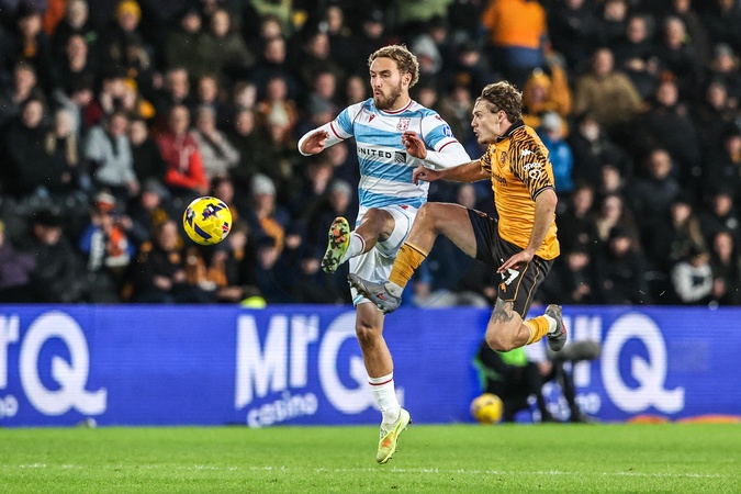 Sam Smith of Wrexham and Regan Slater of Hull City battle for the ball during the Sky Bet Championship match Hull City vs Wrexham at MKM Stadium, Hull, United Kingdom, 10th December 2025, Credit:Ae Cosgrove/News Images / Avalon