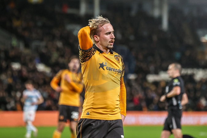 Liam Millar of Hull City reacts to a missed shot on goal during the Sky Bet Championship match Hull City vs Wrexham at MKM Stadium, Hull, United Kingdom, 10th December 2025, Credit:Ae Cosgrove/News Images / Avalon