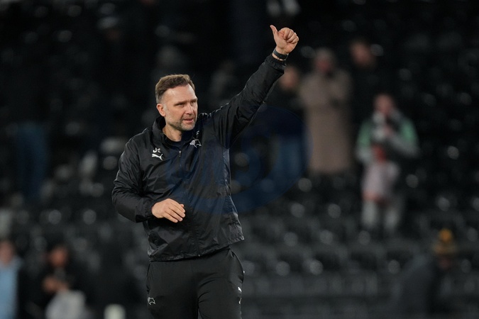 John Eustacemanager of Derby County applauds fans during the Sky Bet Championship match Derby County vs Millwall at Pride Park Stadium, Derby, United Kingdom, 10th December 2025, Credit:Maynard Manyowa/News Images / Avalon