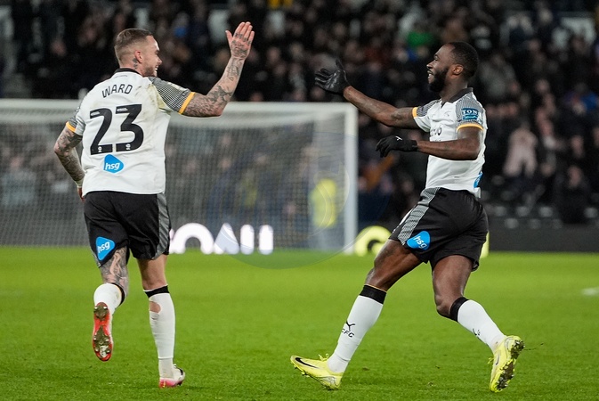 Joe Ward of Derby County and Corey Blackett-Taylor of Derby County celebrate their team's equalising goal that made it 1-1 during the Sky Bet Championship match Derby County vs Millwall at Pride Park Stadium, Derby, United Kingdom, 10th December 2025, Credit:Maynard Manyowa/News Images / Avalon