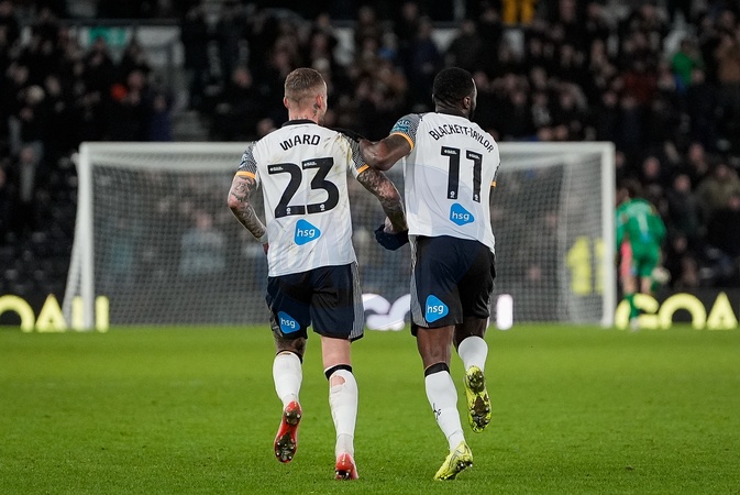 Joe Ward of Derby County and Corey Blackett-Taylor of Derby County celebrate their team's equalising goal that made it 1-1 during the Sky Bet Championship match Derby County vs Millwall at Pride Park Stadium, Derby, United Kingdom, 10th December 2025, Credit:Maynard Manyowa/News Images / Avalon