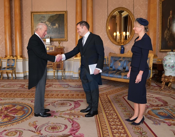 Teemu Turunen, Ambassador from the Republic of Finland, accompanied by his wife, Lotta Mäki-Turunen, presents his credentials to King Charles III during a private audience at Buckingham Palace, London. Picture date: Thursday December 11, 2025., Credit:Yui Mok / Avalon