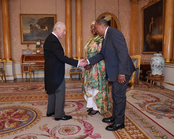 Loreen Bannis-Robert, High Commissioner for the Commonwealth of Dominica, accompanied by her husband, McDonald Roberts, presents her credentials to King Charles III during a private audience at Buckingham Palace, London. Picture date: Thursday December 11, 2025., Credit:Yui Mok / Avalon