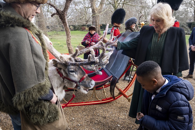 Queen Camilla and Samuel meet Dancer the reindeer in the gardens of Clarence House, London, during the Christmas tree decorating event supported by Helen and Douglas House and Roald Dahl's, Marvellous Children's Charity. Picture date: Thursday December 11, 2025., Credit:Aaron Chown / Avalon