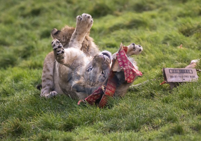 A North African lion cub unwraps a gift at Whipsnade Zoo. Picture date: Thursday December 11, 2025., Credit:Anthony Devlin / Avalon