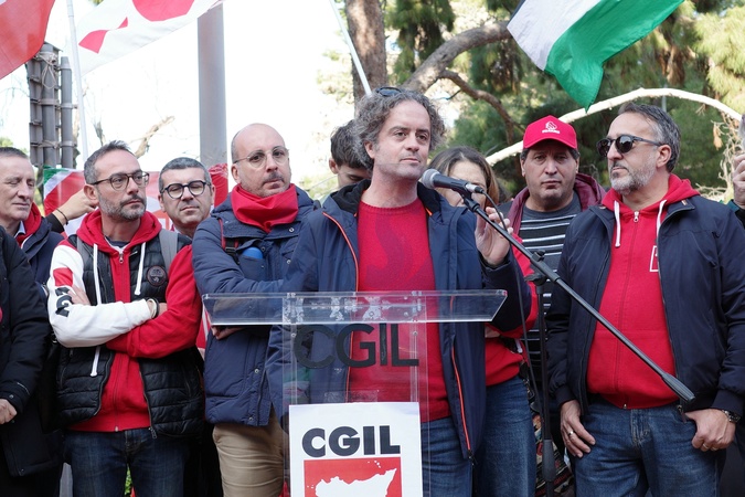 Protesters march through the city center during the national general strike called by the CGIL against the budget law. Pictured is Valerio Tripi, a journalist for la Repubblica, speaking from the stage in front of the Sicilian Regional Presidency. Palermo, Italy 12 December 2025, Credit:Christian Bonaviri / Avalon