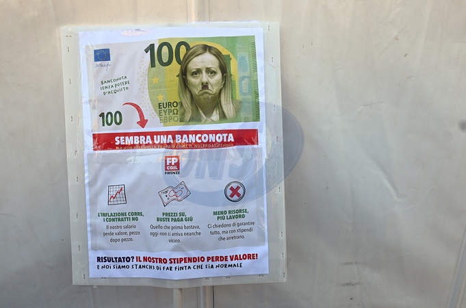 National general strike of the CGIL (Italian General Confederation of Labour). The photo shows promotional material produced for the event featuring a 100-euro note with the face of Prime Minister Giorgia Meloni. Florence, Italy 12 December 2025, Credit:Aleandro Biagianti / Avalon