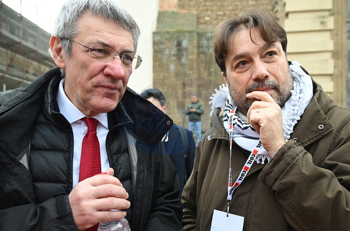 CGIL national general strike. Pictured are secretary Maurizio Landini and Tomaso Montanari, an Italian art historian. Florence, Italy 12 December 2025, Credit:Aleandro Biagianti / Avalon