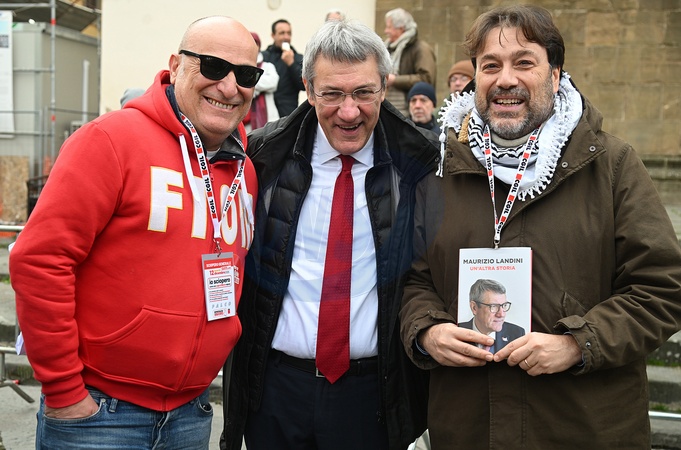 National general strike of the CGIL. Pictured are secretary Maurizio Landini and Tomaso Montanari. National general strike of the CGIL. Pictured are Tomaso Montanari, an Italian art historian, and Daniele Calosi, a city councilor for Sesto Fiorentino. Florence, Italy 12 December 2025, Credit:Aleandro Biagianti / Avalon