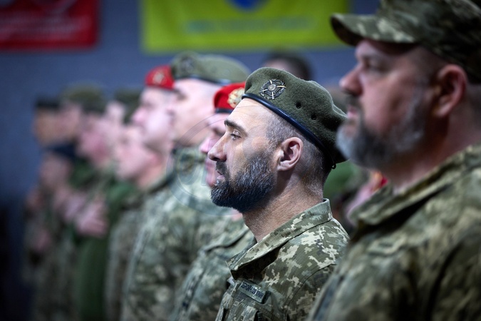 President of Ukraine Volodymyr Zelenskyy meets with soldiers on the Day of the Land Forces, presenting them with state awards and combat flags, honorary distinction ribbons "For Courage and Bravery,” and a ribbon bearing an honorary name to unit commanders, Kharkiv, Ukraine, 12 December 2025., Credit:Office of the President of Ukraine / Avalon