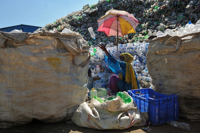 Chattogram, Bangladesh- A Woman sorts plastic bottles from a mountain of discarded waste at a recycling facility in Chattogram, Bangladesh. These materials are processed and exported to countries including Turkey, Dubai, and the USA—highlighting both the massive environmental burden of plastic pollution and the vital role recycling plays in the global circular economy., Credit:Md Rafayat Haque Khan / Avalon