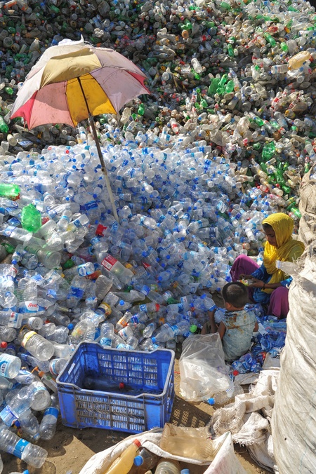 Chattogram, Bangladesh- A Woman sorts plastic bottles from a mountain of discarded waste at a recycling facility in Chattogram, Bangladesh. These materials are processed and exported to countries including Turkey, Dubai, and the USA—highlighting both the massive environmental burden of plastic pollution and the vital role recycling plays in the global circular economy., Credit:Md Rafayat Haque Khan / Avalon
