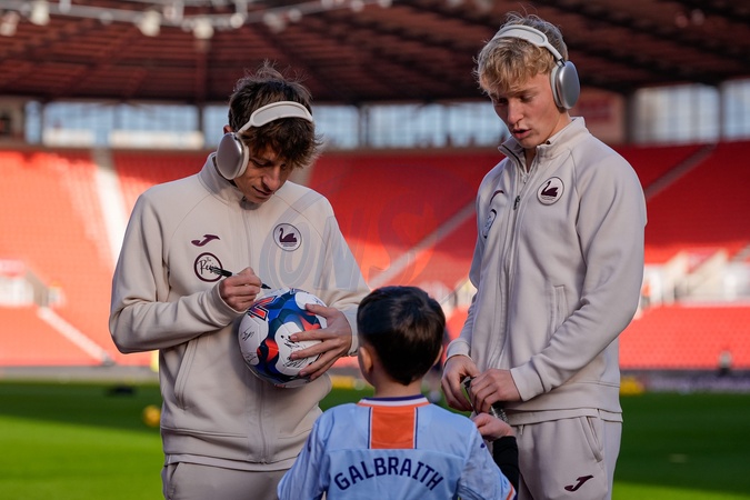 Gonçalo Franco of Swansea City and Melker Widell of Swansea City sign a ball for a fan wearing an Ethan Galbraith replica shirt during the Sky Bet Championship match Stoke City vs Swansea City at Bet365 Stadium, Stoke-on-Trent, United Kingdom, 13th December 2025, Credit:Maynard Manyowa/News Images / Avalon