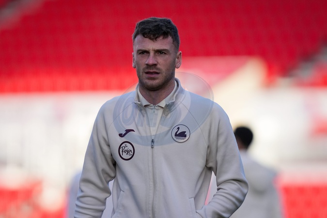 Josh Tymon of Swansea City inspects the pitch during the Sky Bet Championship match Stoke City vs Swansea City at Bet365 Stadium, Stoke-on-Trent, United Kingdom, 13th December 2025, Credit:Maynard Manyowa/News Images / Avalon