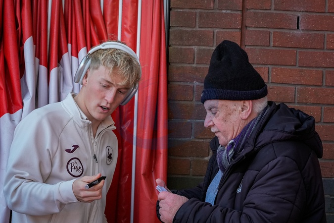 Melker Widell of Swansea City sigsn an autograph during the Sky Bet Championship match Stoke City vs Swansea City at Bet365 Stadium, Stoke-on-Trent, United Kingdom, 13th December 2025, Credit:Maynard Manyowa/News Images / Avalon